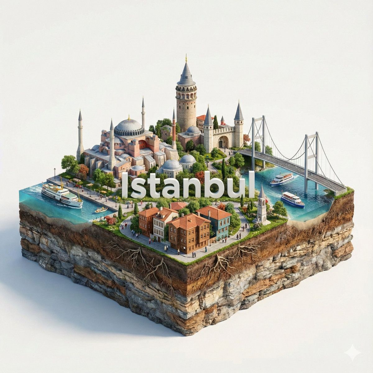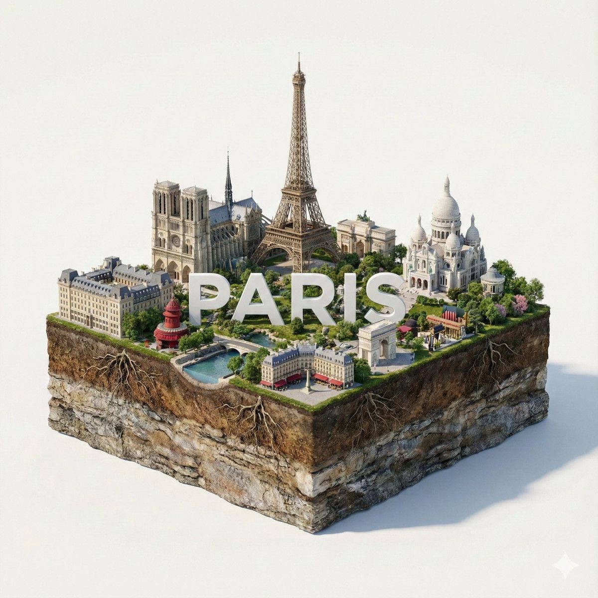 “Paris’in hiper-gerçekçi 3D kare dioraması; alt kısmında kayalar, kökler ve toprak katmanlarını gösteren kesitli bir zemin yapısıyla oyulmuş bir görünüm. Üstte: Paris’in ikonik yapıları, mimarisi ve kültürel öğelerini içeren, masalsı bir şehir manzarası. Modern ve sade “Paris” yazısı kompozisyona doğal bir şekilde entegre edilmiş. Tamamen beyaz stüdyo arka planı ve yumuşak doğal aydınlatma. DSLR fotoğraf kalitesinde net, canlı, büyülü gerçekçilik estetiğinde. Boyut: 1080×1080.”