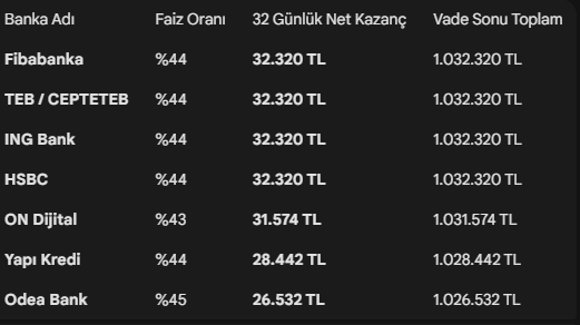 (Not: Net kazanç hesaplamaları bankaların uyguladığı vergi ve işlem ücretlerine göre değişiklik gösterebilir.)
